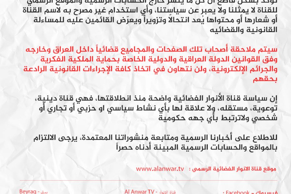 🔴 تحذير وتنبيه قانوني من ادارة قناة الانوار الفضائيه🔴